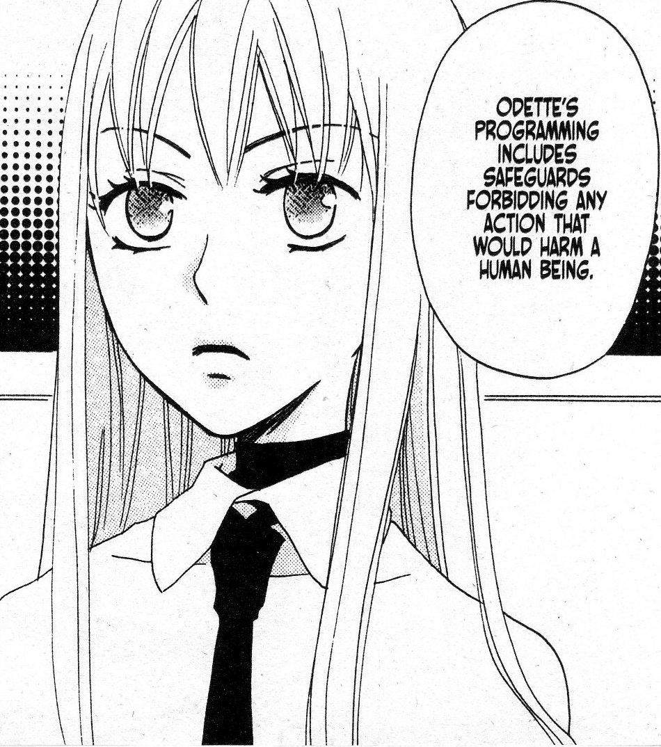 Now, I realize it’s kind of silly to apply the rules created by one author to another author’s work. However, Julietta Suzuki never really spells out exactly what the laws are for the androids in Karakuri Odette or if there even are any regulations. Quite a bit can be gleaned from context though and a few of the androids do explicitly indicate whether they have restrictions regarding the harming of humans. So, using the Three Laws of Robotics as a starting point, I’d like to take a closer look at the androids of Karakuri Odette. (Warning: Spoilers up through Volume 5 may be involved.)
