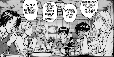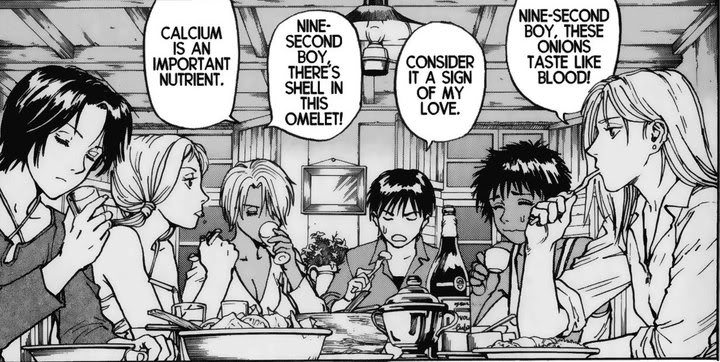 There are plenty of scenes in “non-food” manga involving food that are fun and important, too. I offered up Old Boy as one example. I found it interesting that the two “non-food” series mentioned in the comments both happened to have post-apocalyptic, science fiction elements. Yasuhiro Nightow’s Trigun and Trigun Maximum have quite a few moments involving food and drink. Wolfwood and Vash fighting over spaghetti early on in Trigun Maximum amused me greatly. Also mentioned was a delightful scene from Eden: It’s an Endless World! by Hiroki Endo. I don’t remember which volume this is from (I think it’s volume eight), but I do remember the moment: